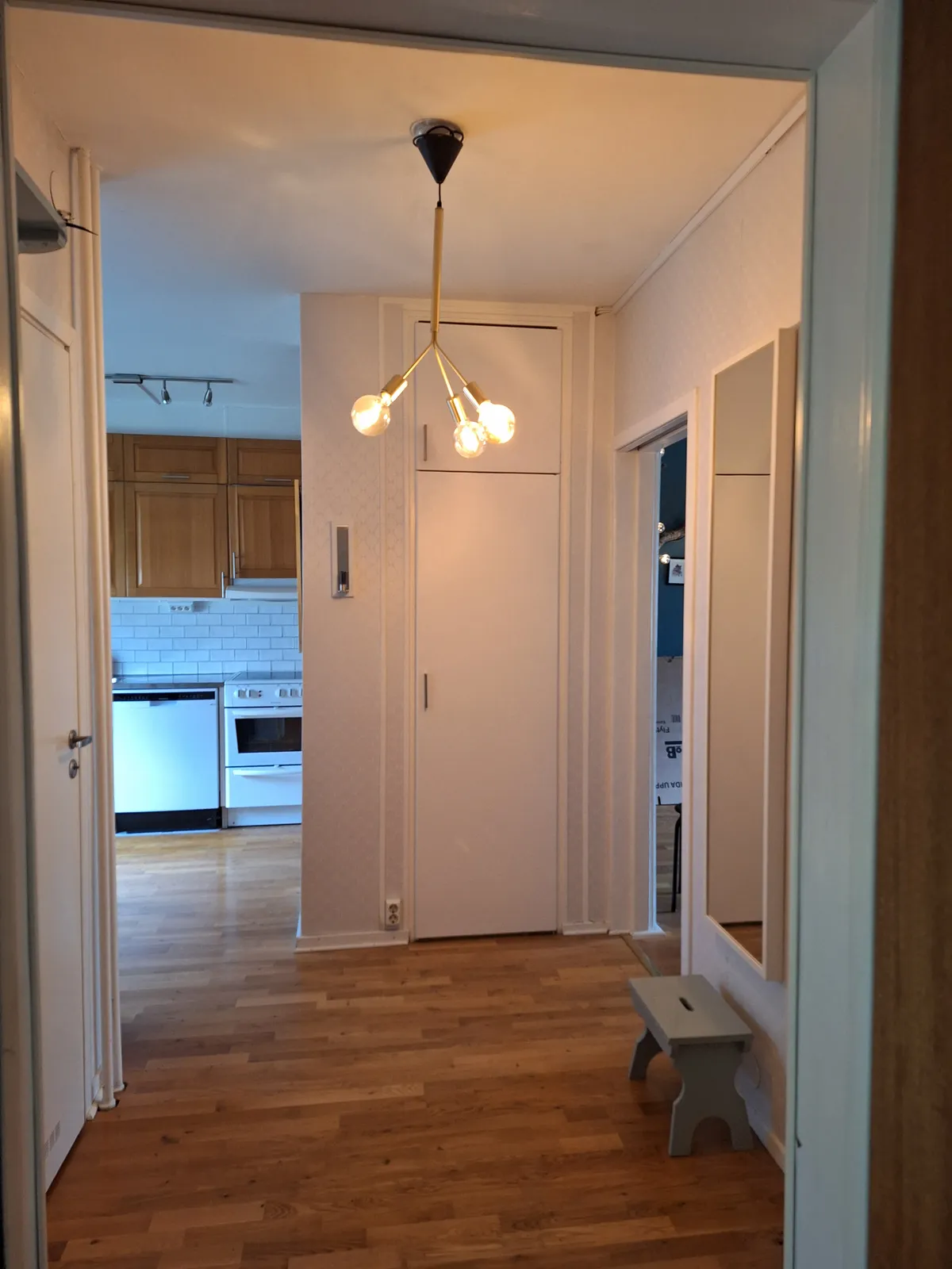Trevlig, ljus genomgångslägenhet med fönster i motstående väderstreck. Inglasad balkong i söderläge. Hall, sovrum, vardagsrum, kök och badrum med badkar. Gott om förvaring, klädkammare. Delvis möblerad; köksbord med fyra stolar, bokhyllor, hurts, TV och om man önskar visst husgeråd. Obs inte den köksmöblering och bokhyllor som syns på bilden. Trevliga uteplatser, mycket grönska, bra förening med tillgång till träningslokal. Nära till kollektivtrafik vid Gamlestads torg. Utsikt mot centrala Göteborg.