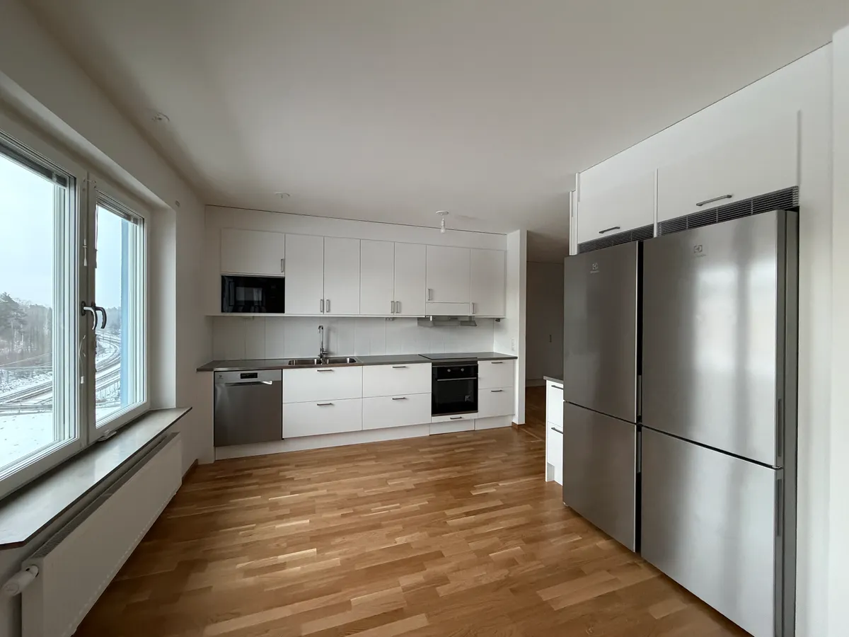Rymligt 4-rumslägenhet med välplanerad planlösning och fräscha ytskick. Lägenheten ligger högt upp i huset på våning 6 och har en balkong med trevlig eftermiddagssol. Bostaden erbjuder två badrum som underlättar vardagen för hela familjen. Välkommen hem till Flora – moderna hyresrätter i hjärtat av Söderdalen, Jakobsberg I Flora bor du bekvämt i en nyproducerad lägenhet med hög standard och genomtänkta materialval. Köket är stilrent och modernt med vita luckor, rostfria detaljer, bänkskiva och stänkskydd i laminat samt utrustat med både diskmaskin och mikrovågsugn. Badrummet har grått klinkergolv, vita helkaklade väggar och kombimaskin för smidig tvätt i hemmet. Här ingår det mesta i hyran – uppvärmning, kallvatten, bredband (1000/1000 Mbit/s), basutbud för TV och telefoni via Telia samt ett eget förråd i källare eller på vind. Varmvatten och hushållsel mäts individuellt, vilket gör att du bara betalar för din faktiska förbrukning. I huset finns även cykelrum samt förråd för barnvagn och rullstol. Flora består av sexvåningshus i ljusblå och vit putsfasad, byggda kring en grön och välkomnande innergård – en naturlig plats för gemenskap och avkoppling. Här bor du granne med Lillängsparken och har nära till både förskola, skolor, träningsanläggningar, simhall och golfbana. På gångavstånd når du Jakobsbergs Centrum med butiker, restauranger och pendeltåg som tar dig till Stockholm City på ca 20 minuter. En kort cykeltur bort ligger Barkarby Handelsplats med ett brett shoppingutbud. Med solpaneler på taken, källsortering i huset och garageplatser att hyra via Sveriges Parkering är Flora ett hem som förenar modern bekvämlighet med hållbarhet.